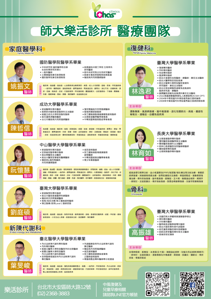 | 早診 | 陳哲信(家醫) 阮懷慧(家醫) | 葉旻峻(新陳) 阮懷慧(家醫) | 姚振文(家醫) 阮懷慧(家醫) | 陳哲信(家醫) 阮懷慧(家醫) | 葉旻峻(新陳) 阮懷慧(家醫) | 陳哲信-每月第1.3.5週 葉旻峻-每月第2.4週 |